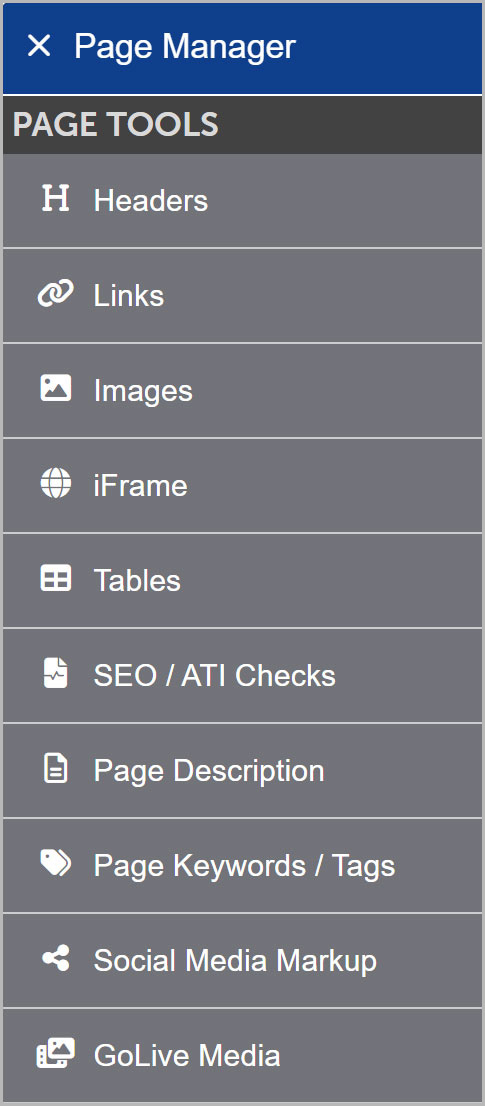 Screenshot of the page manger main tools list after opening the hamburger menu
