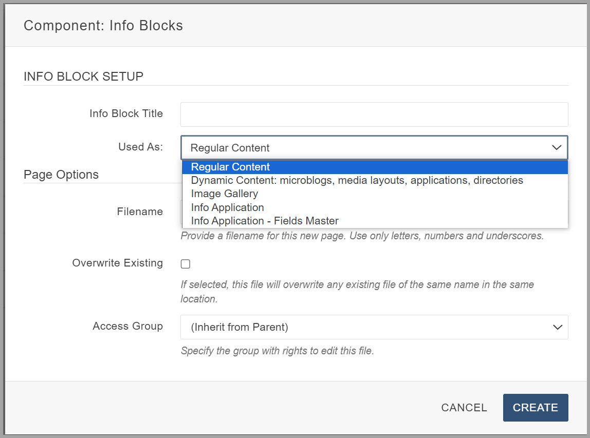 2. Under Used As, select the type of info-block you are creating. The options are: