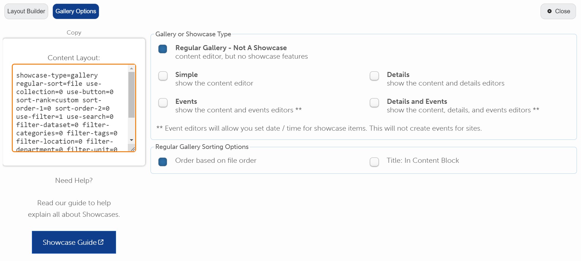 Located next to the content layout editor you'll see two icons that are the presentation and the snapshot options. These will open new spaces that allow you to configure the options for the layout and snapshot.
