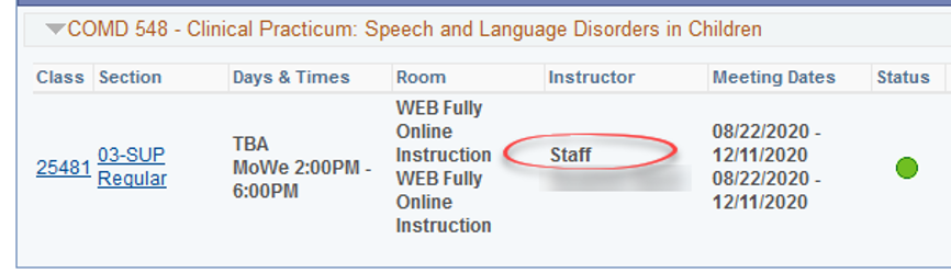 The Class search will display "Staff" if the instructor is left blank.